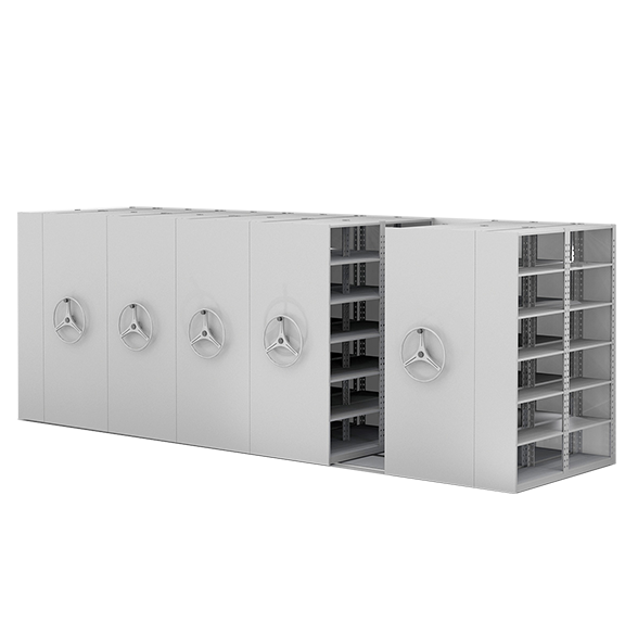 Anaqueles metálicos modulares con movimiento para almacenamientos masivos dentro de un lugar de trabajo contribuyendo a mantener el orden y el trabajo prolijo.